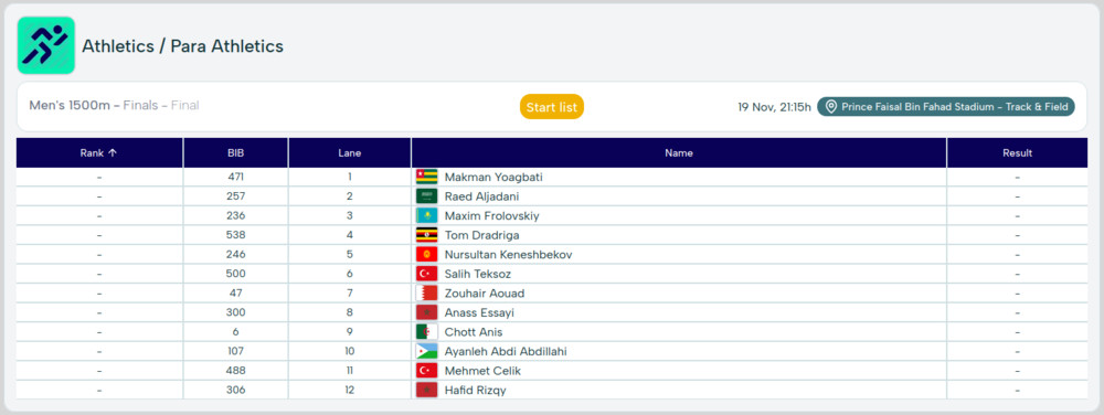 Он выступает в состязаниях по легкой атлетике в беге на 1500 метров, где всего были заявлены 16 спортсменов.