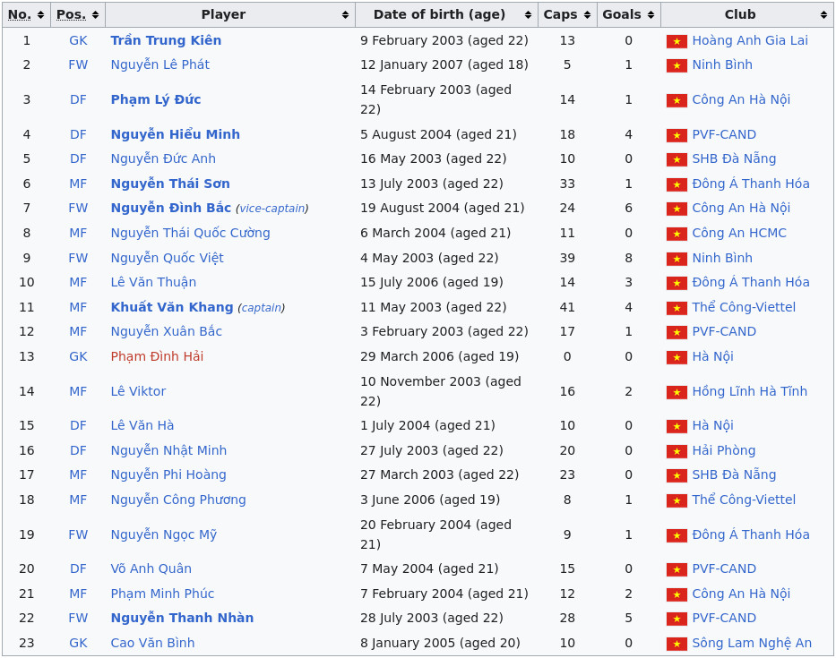 В состав команды из Вьетнама вошли 23 игрока, которые выступают за местные клуба.